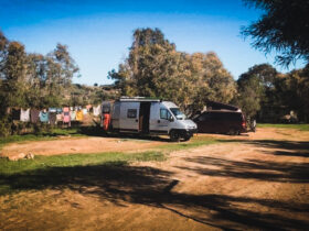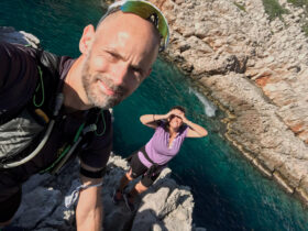 Storm fik overtalt Jesper til at hoppe i bølgerne med deres boards. Så jeg skiftede også til badedragten og listede ned i bølgen azurblå. Vandet er iskoldt – men dejlig forfriskende, når man kommer op igen.