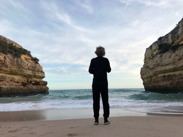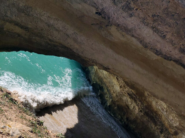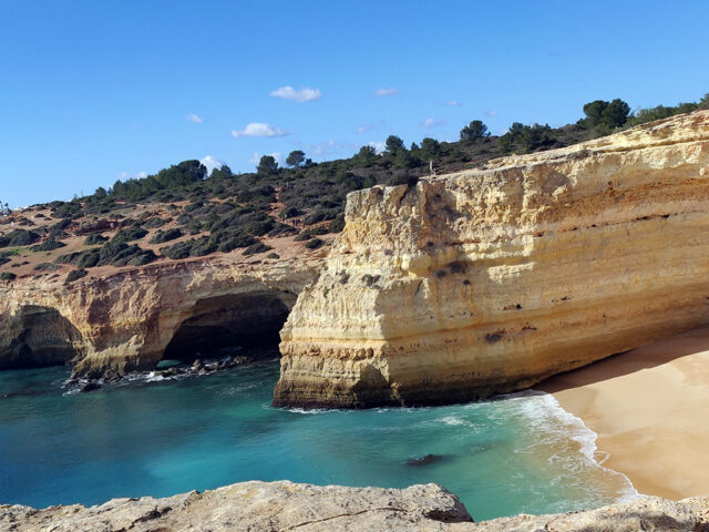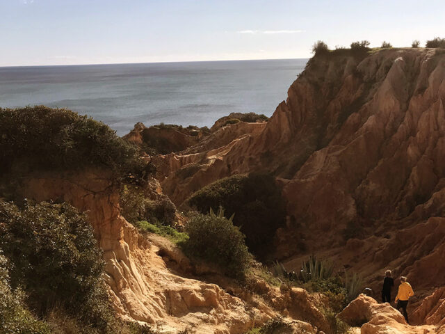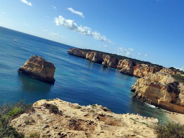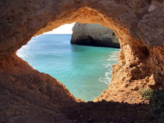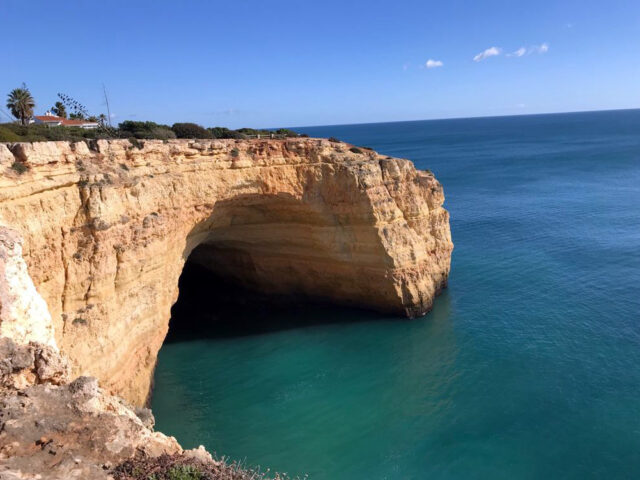 Ungerne og jeg gik videre ud til hulen Benagil. Den er et af Portugals mest kendte varetegn og i alle turistbrochurer. Man kan se den ned gennem hullet. Flere sejler dertil og nyder farverne i det azurblå vand og lysindfaldet gennem hullet – det skulle vist være magisk at stå nede i hulen. Men vi nøjes med at kigge ned og forestille os det.
