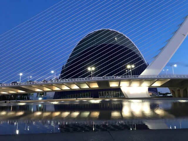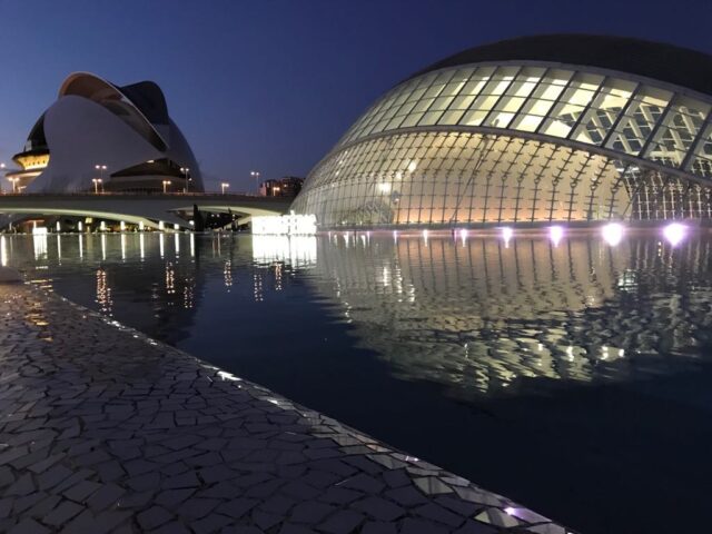 Valencias videnskabspark er ekstrem smuk arkitektur – men indholdet er dybt skuffende. Så hvis du kommer til Valencia vil jeg foreslå dig at cykle ud til parken med en picnickurv. Nyd solen, de mange bassiner, arkitekturen og bliv til mørket falder på, så du også når at opleve det, når lysene lyser bygningerne op.