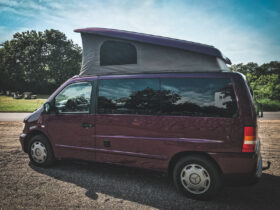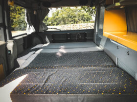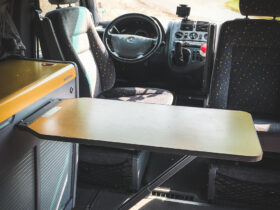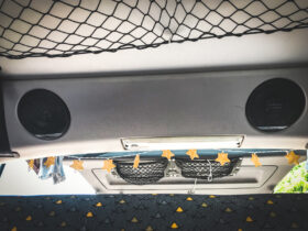 We have 2 teenage rooms – one in the tent and one in the back of the car. The office is on the turned front seat and the kitchen-living room is in the middle of the car.