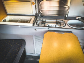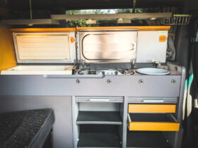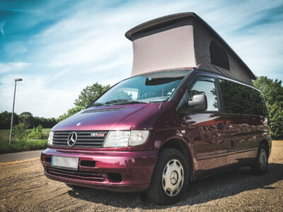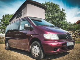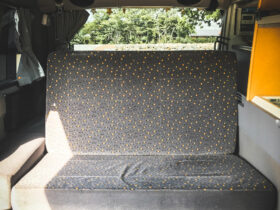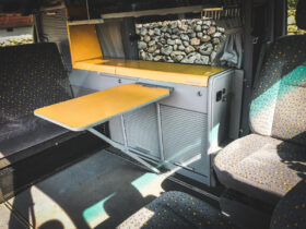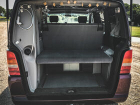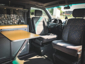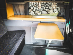 Even though the camper is small and compact, it still offers 4 beds and height when the roof is lifted. The front seats can be turned so we can sit all 4 around the table eating or playing board games.