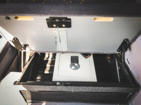 In order to get extra space, we have been creative with storage options and shelves with lights over the kitchen.